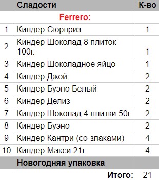 Кол-во сладостей: 21 шт.