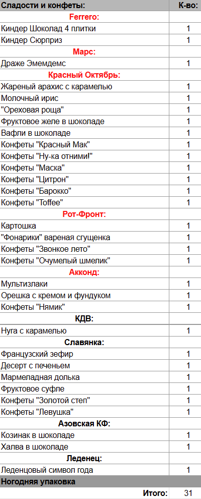 Кол-во сладостей: 31 шт.