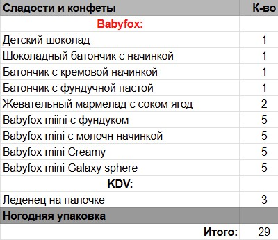 Кол-во сладостей: 29 шт.