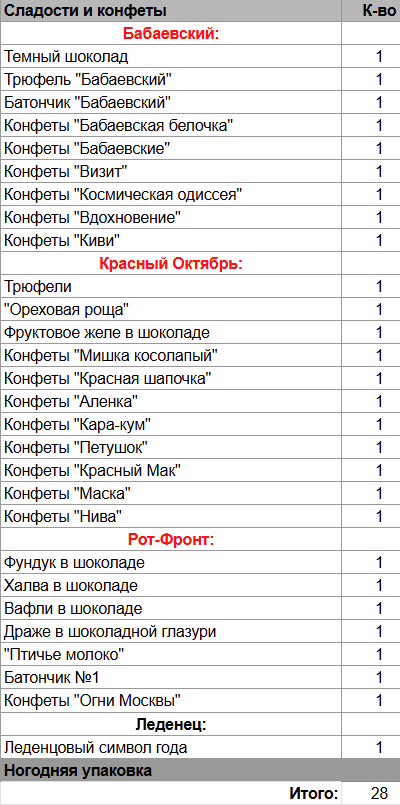 Кол-во сладостей: 28 шт.
